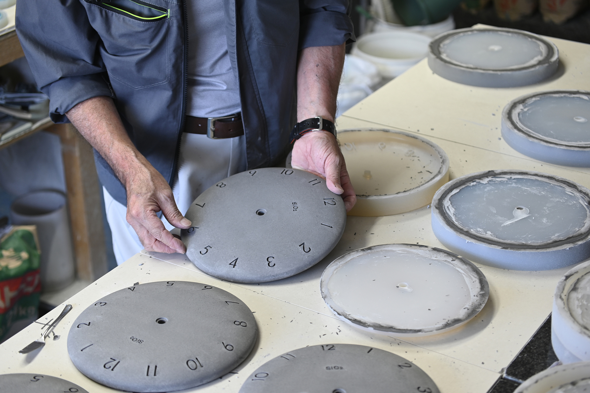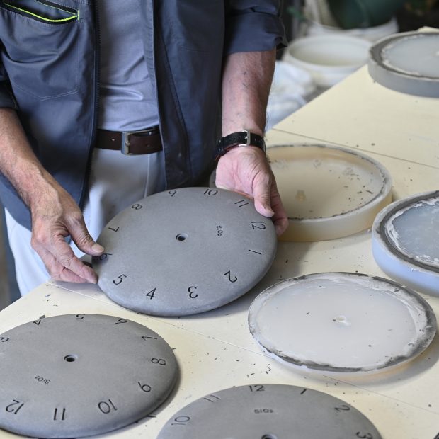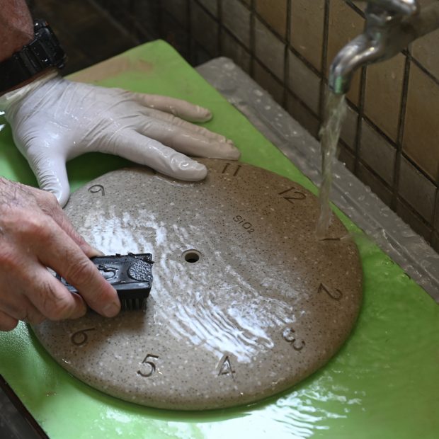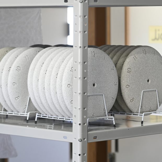 In this clock, pure white crystalline limestone aggregates, known as “Kansuiseki,” are used, which are also employed in landscaping, etc. If you examine the details, you will notice that each stone reflects light differently, giving them various expressions. The gently curving shape of the clock creates changes in light and shadow on the surface, accentuating the expression of the stone. It is very difficult to wash away the surface of the stone cleanly without destroying the edges of the numbers engraved on the clock, and the delicate handiwork of the craftsmen at “soil” has made this possible. This time, Lemnos aimed to construct a product, namely a clock, using traditional materials and techniques without excess or deficiency. There are four color variations: white (diatomite from Akita) and pink (diatomite from Noto), both of which showcase the natural colors of diatomaceous earth, along with beige and gray, the colors of which are adjusted with pigments.
